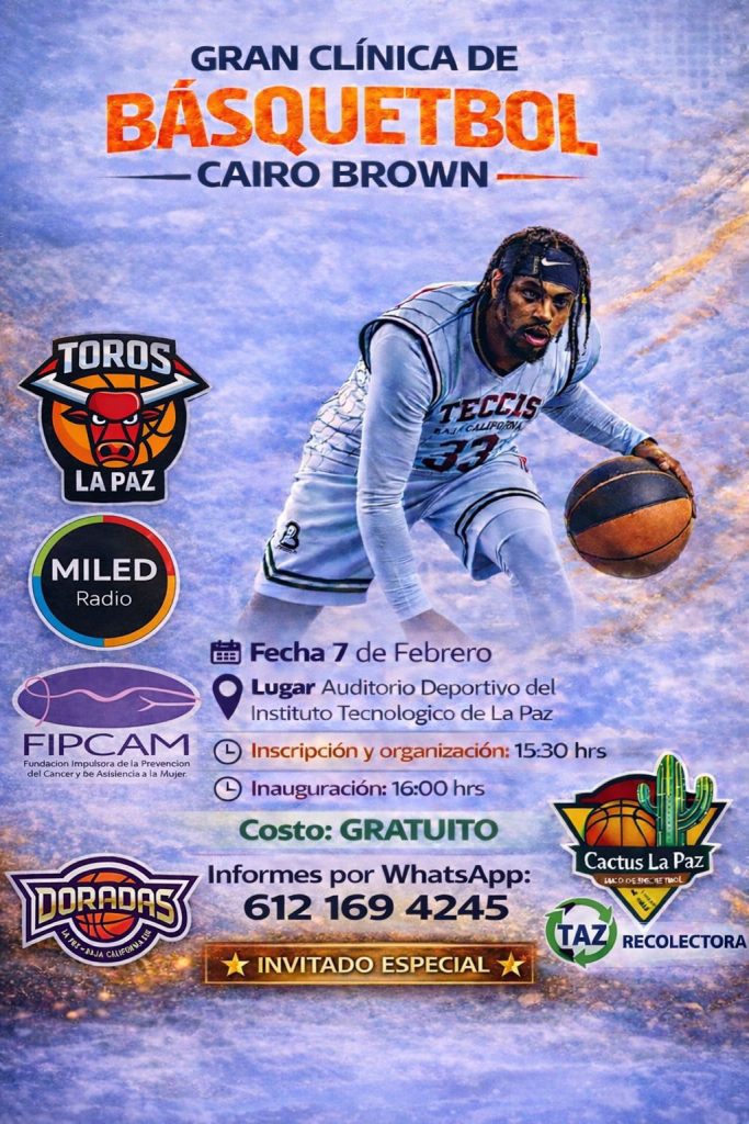 - La clínica será impartida por el exjugador profesional Cairo Brown con la organización de la Fundación Fipcam, Súper Stereo Miled, Toros La Paz, Doradas y Cáctus La Paz