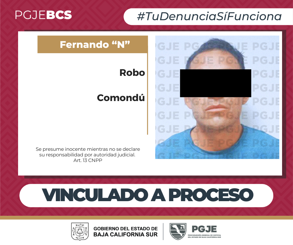 Comondú, BCS.- La Procuraduría General de Justicia del Estado (PGJE) de Baja California Sur obtuvo la vinculación a proceso y prisión preventiva de Fernando “N” por su probable responsabilidad en el delito de robo a lugar cerrado que probablemente cometió la tarde del 25 de marzo en un comercio ubicado en Blvd. Agustín Olachea e Ignacio Allende en Ciudad Constitución.