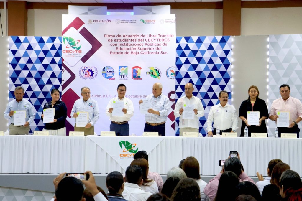 En un acto encabezado por el Profr. Víctor Manuel Castro Cosío, Gobernador del Estado, como testigo de honor, se llevó a cabo la firma del Acuerdo General para establecer un libre tránsito estudiantil del alumnado de nivel medio superior a superior en el estado, entre el Colegio de Estudios Científicos y Tecnológicos del Estado de Baja California Sur (CECyTEBCS) y las principales instituciones de educación superior públicas de la entidad.