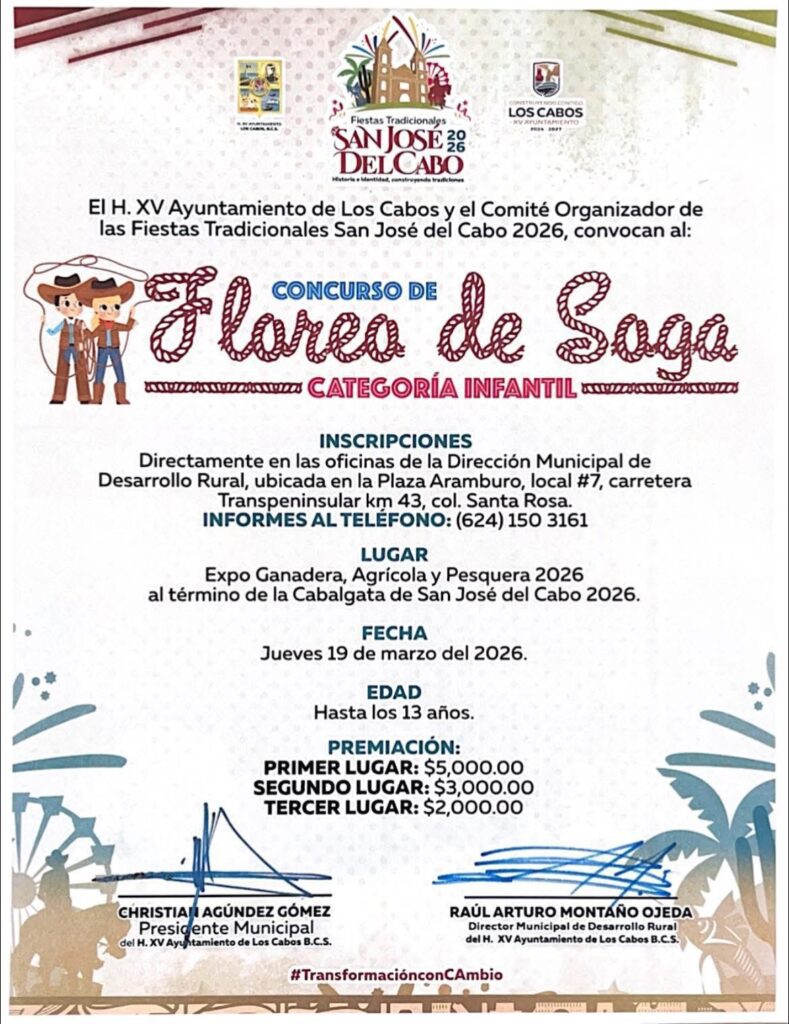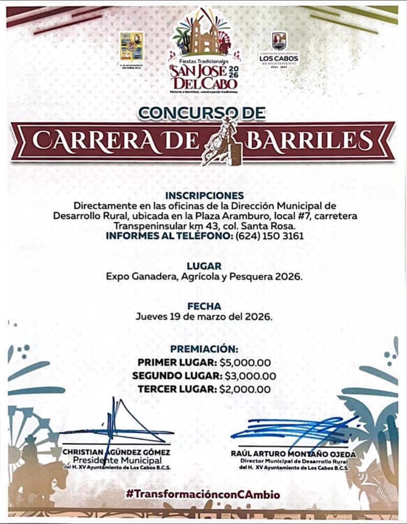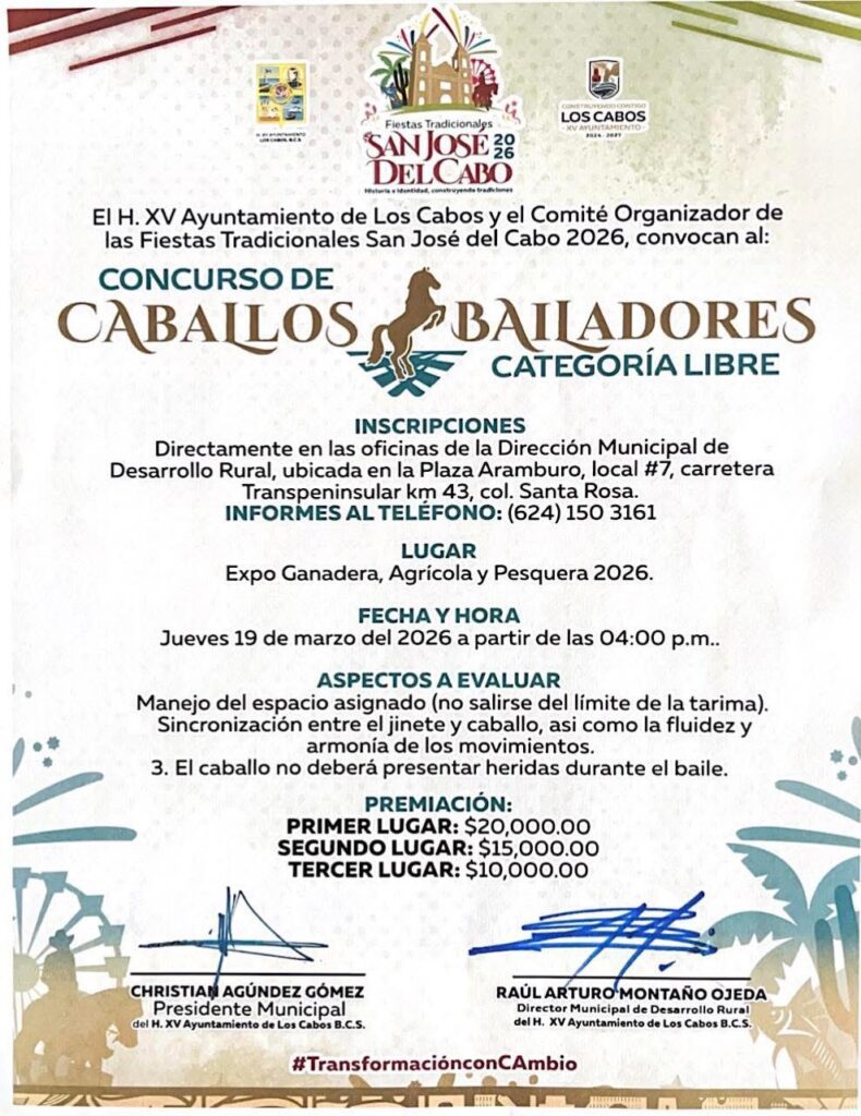Los Cabos, Baja California Sur.– El XV Ayuntamiento de Los Cabos, a través de la Dirección Municipal de Desarrollo Rural y en coordinación con el Comité Organizador de las Fiestas Tradicionales San José del Cabo 2026, invita a la ciudadanía a participar en las disciplinas ecuestres que se desarrollarán el próximo jueves 19 de marzo en el marco de la Expo Ganadera, Agrícola y Pesquera 2026.