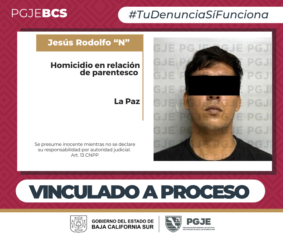 La Paz, BCS.- El lunes 13 del mes en curso Jesús Rodolfo “N”, fue vinculado a proceso penal por homicidio por razón de parentesco y se encuentra en prisión preventiva oficiosa; por el hecho ocurrido el lunes 6 de octubre en la Col. Lázaro Cárdenas en La Paz.