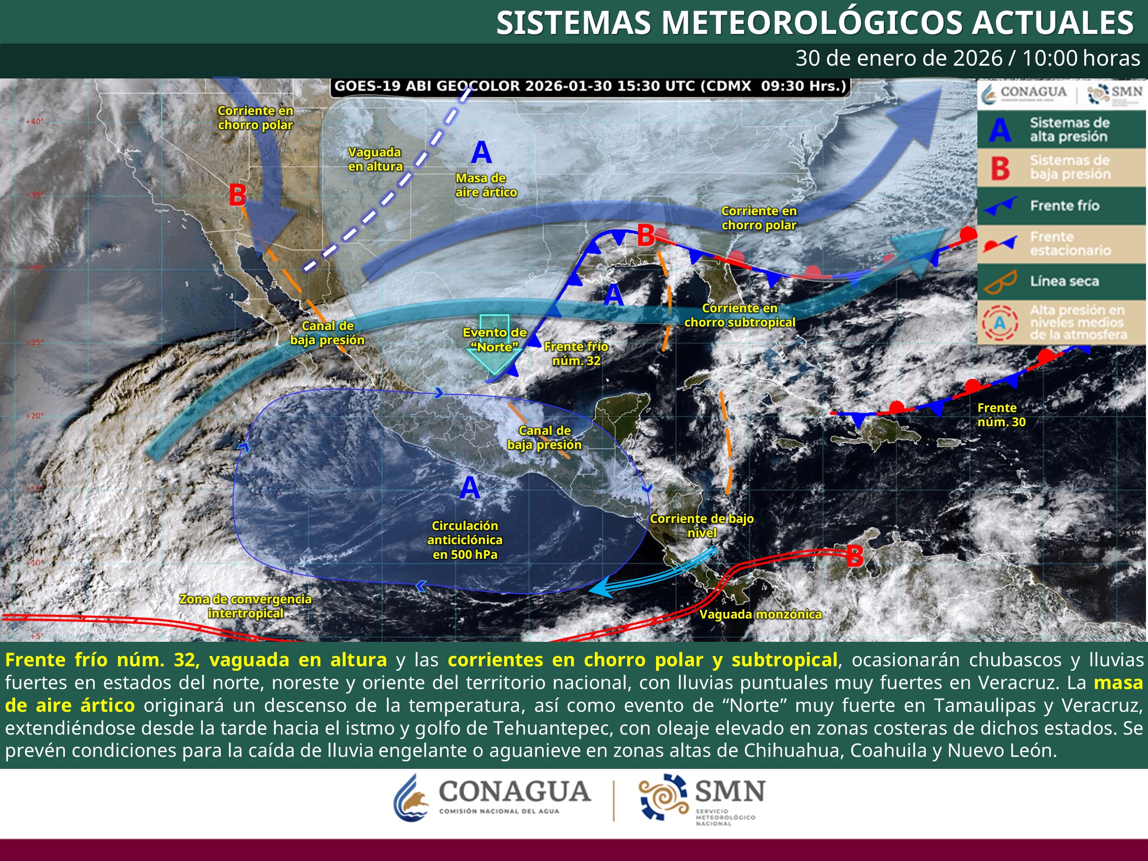 La masa de aire ártico que impulsa este fenómeno originará un evento de “Norte” con intensidades de muy fuertes a intensas, impactando inicialmente las costas de Tamaulipas y Veracruz. Se prevé que durante el transcurso de la noche estas condiciones se extiendan hacia Tabasco, Península de Yucatán y la región del Istmo y Golfo de Tehuantepec, generando oleaje elevado que representa un riesgo para las actividades marítimas y costeras.
