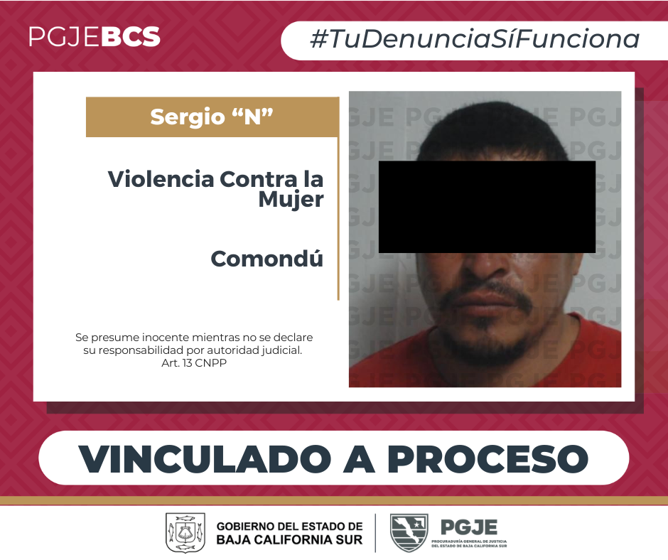 Comondú, BCS.- Sergio “N” tiene prohibido acercarse a la víctima, así como a ciertos lugares, luego de que la Procuraduría General de Justicia del Estado (PGJE) de Baja California Sur, en la audiencia de control de detención realizada el 11 de febrero del presente año, logró que un Juez de Control lo vinculara a proceso por el delito de lesiones cometidas contra la mujer en razón de género.