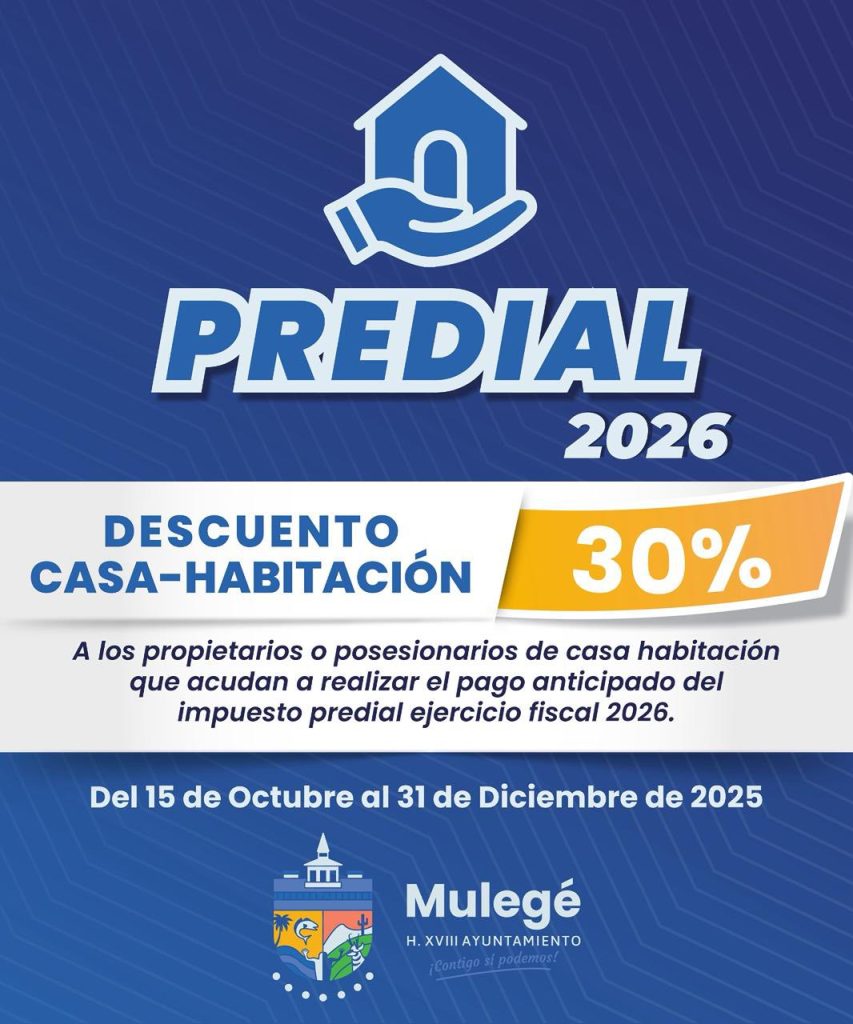 Para casa habitación, se otorgará un 30% de descuento a quienes realicen su pago anticipado del 15 de octubre al 31 de diciembre de 2025; 20% del 1 al 31 de enero, 15% del 1 al 28 de febrero, y 10% del 1 al 31 de marzo de 2026. Además, se aplicará un 50% de descuento en multas y recargos de ejercicios anteriores durante el periodo comprendido entre el 15 de octubre de 2025 y el 31 de marzo de 2026, aplicable al impuesto predial de casa habitación, exceptuando la tasa industrial.