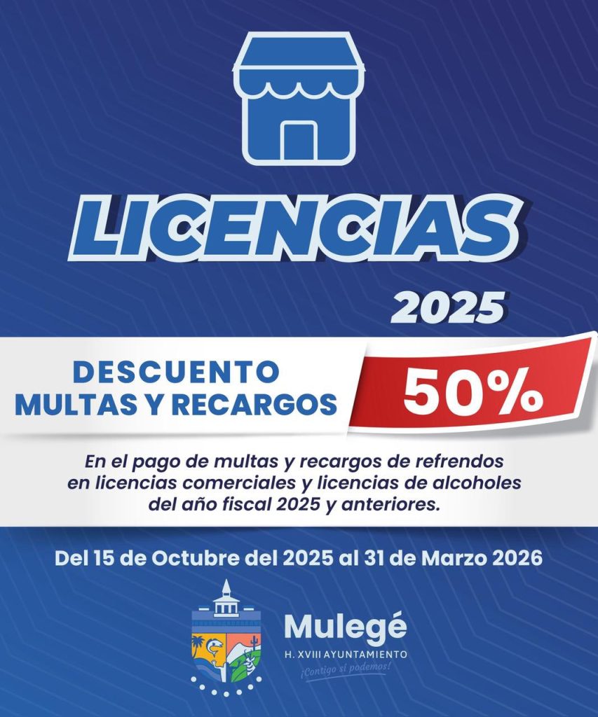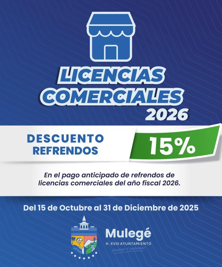 En cuanto al pago de refrendos de licencias comerciales y de alcoholes, se anunció un 15% de descuento en licencias comerciales y 10% en licencias de alcohol, ambos vigentes del 15 de octubre al 31 de diciembre de 2025. También se aplicará un 50% de descuento en multas y recargos de este rubro entre el 15 de octubre de 2025 y el 31 de marzo de 2026.