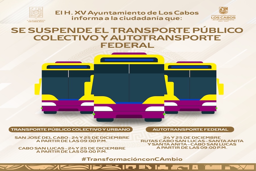 En San José del Cabo, el transporte público colectivo y urbano operará los días 24 y 25 de diciembre hasta las 21:00 horas, realizando su última corrida desde las bases correspondientes, manteniendo guardias para las y los choferes que decidan continuar laborando.