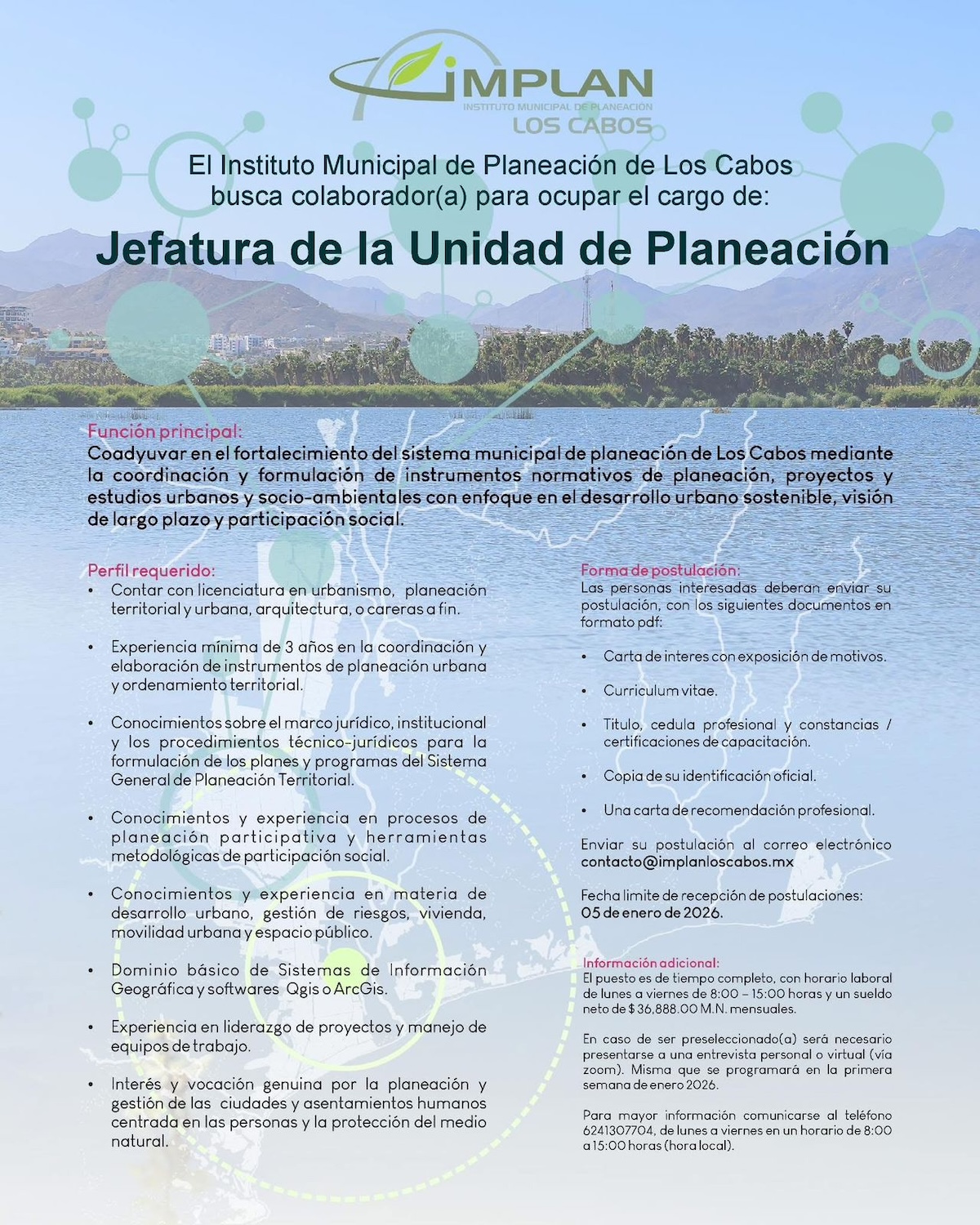 Con el objetivo de fortalecer el sistema municipal de planeación y los procesos técnicos que contribuyen al desarrollo urbano del municipio, el XV Ayuntamiento de Los Cabos, publicó la convocatoria emitida por el Instituto Municipal de Planeación (IMPLAN) para ocupar la Jefatura de la Unidad de Planeación.