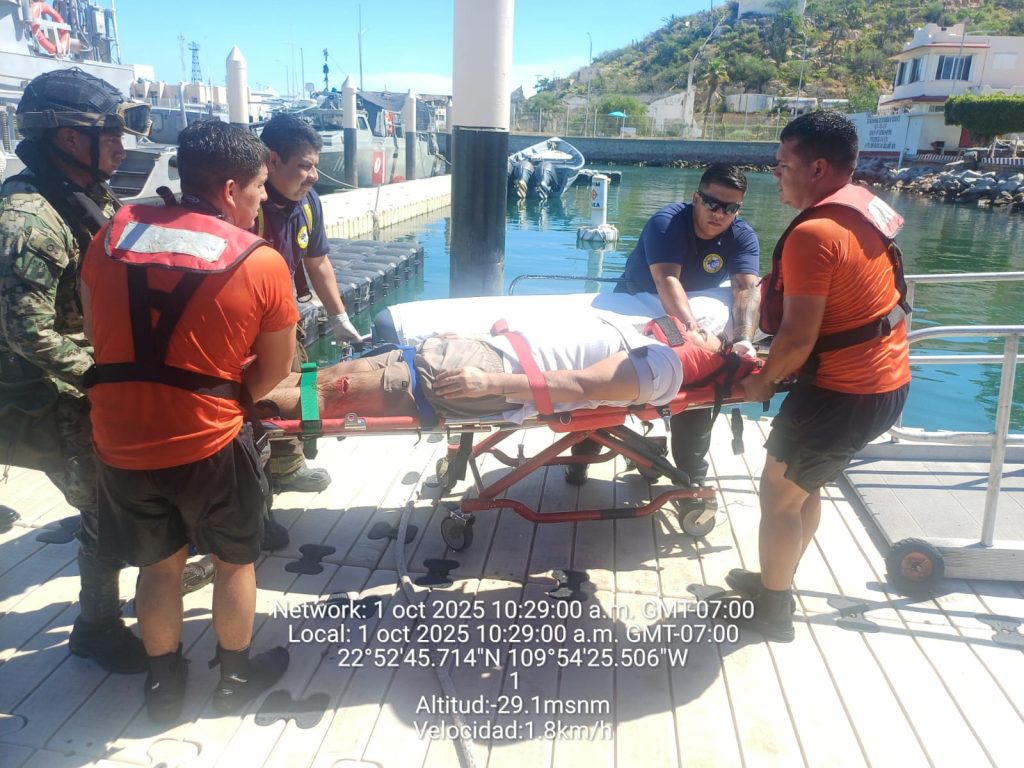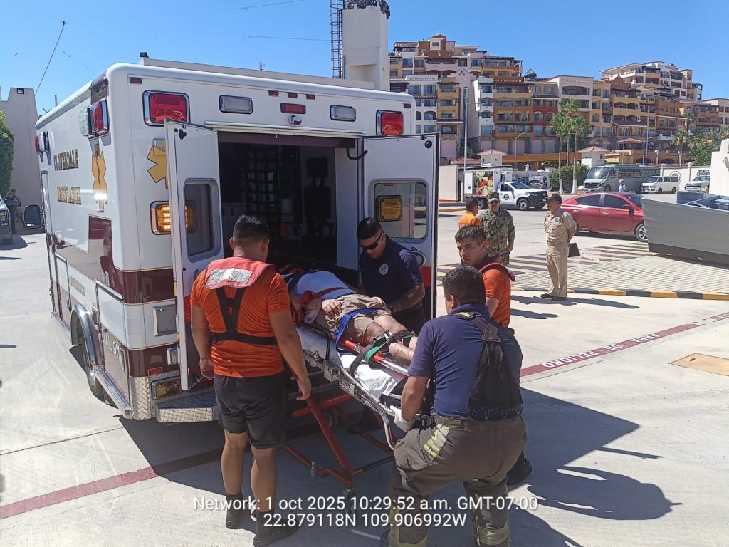 Bajo este contexto, personal naval realizó la valoración inicial y proporcionó los primeros auxilios a un hombre de 28 años de edad, quien había sido impactado contra las rocas sufriendo una lesión de gravedad. Posteriormente, fue trasladado al muelle del Sector Naval, donde lo recibió personal de paramédicos de una ambulancia del H. Cuerpo de Bomberos de Cabo San Lucas, para trasladarlo a un hospital de la localidad, con el fin de recibir atención médica especializada.