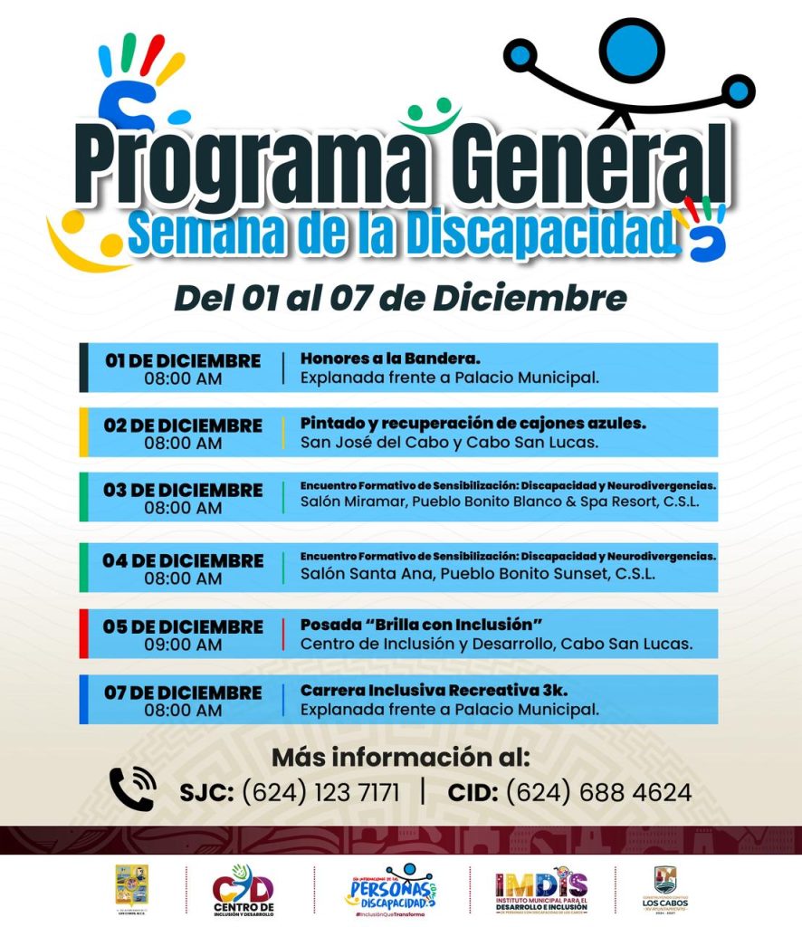 El director general del IMDIS, Fernando Ulises Altamirano Valdez informó que el programa iniciará el 01 de diciembre con los honores a la bandera frente al palacio municipal, a partir de las 08:00 horas. Para el 02 de diciembre, desde la misma hora, se realizará una jornada de pintado y recuperación de cajones azules en diversas zonas de San José del Cabo y Cabo San Lucas, con el propósito de reforzar el respeto a los espacios accesibles y la movilidad segura para personas con discapacidad.
