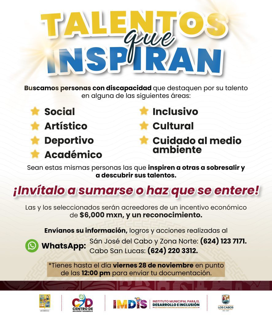 Los Cabos, Baja California Sur.- El Instituto Municipal para el Desarrollo e Inclusión de las Personas con Discapacidad de Los Cabos (IMDIS) invita a participar en la convocatoria “Talentos que Inspiran”, un programa dirigido a personas con discapacidad con el objetivo de reconocer y visibilizar sus habilidades, logros y aportaciones a la comunidad en distintos ámbitos.