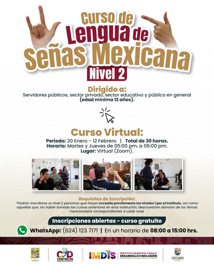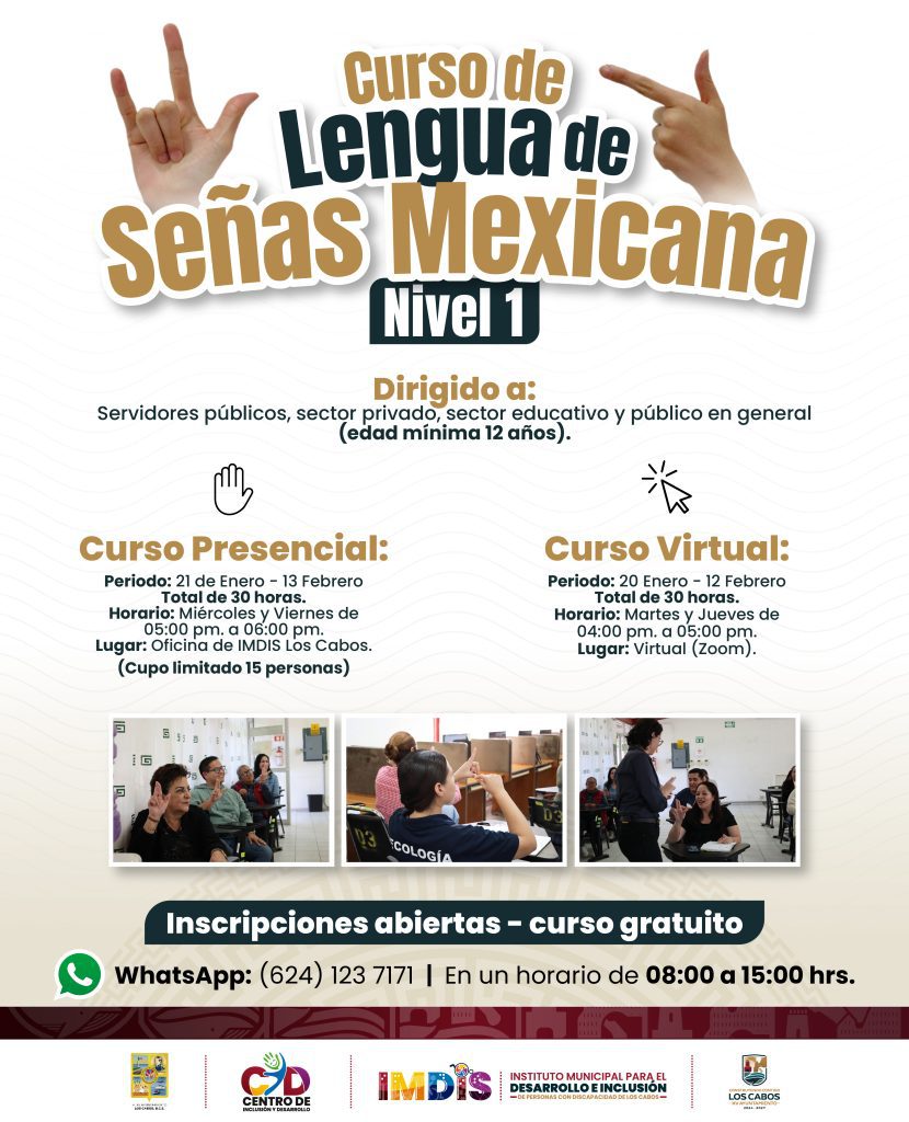 Los Cabos, Baja California Sur.– Con el propósito de fortalecer una comunidad más incluyente, empática y sin barreras de comunicación, el Instituto Municipal para el Desarrollo e Inclusión de Personas con Discapacidad (IMDIS) informa la apertura de nuevos cursos gratuitos de Lengua de Señas Mexicana (LSM), en los niveles 1 y 2, dirigidos a la ciudadanía interesada en aprender esta herramienta de comunicación para su vida cotidiana, académica o laboral.