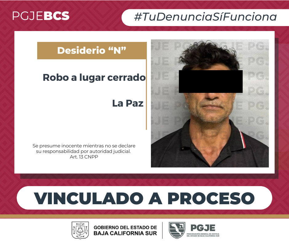 La Paz, BCS.- La Procuraduría General de Justicia del Estado (PGJE) de Baja California Sur logró vinculación a proceso de Desiderio “N”, de 43 años de edad, por su probable responsabilidad en el delito de robo a lugar cerrado, tras audiencia inicial realizada el 10 de febrero del presente año en la ciudad de La Paz.