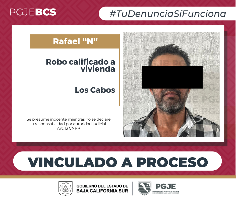 Los Cabos, BCS.- Durante audiencia inicial celebrada el 18 de marzo, la Procuraduría General de Justicia del Estado (PGJE) de Baja California Sur, obtuvo auto de vinculación a proceso en contra de Rafael “N”, por su probable responsabilidad en el delito de robo calificado cometido en vivienda.