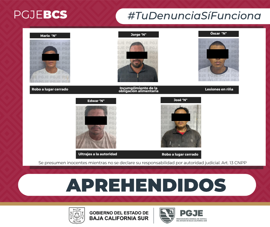 En seguimiento a investigaciones por denuncias de actividades ilícitas, la Procuraduría General de Justicia del Estado (PGJE), realizó operativos mediante los cuales, aprehendió a 5 personas del sexo masculino.