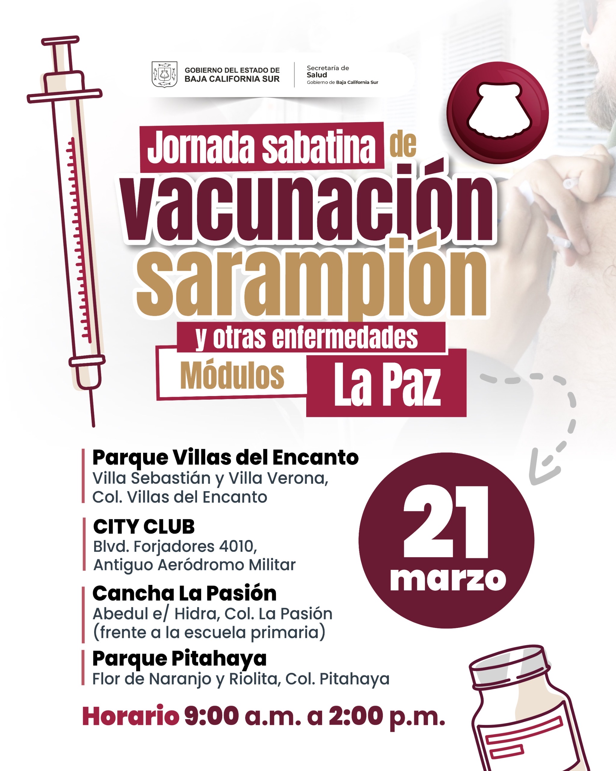 Con el objetivo de ampliar la cobertura de vacunación contra el sarampión, el Gobierno del Estado, a través de la Secretaría de Salud, instalará puestos de vacunación este fin de semana en la ciudad de La Paz.