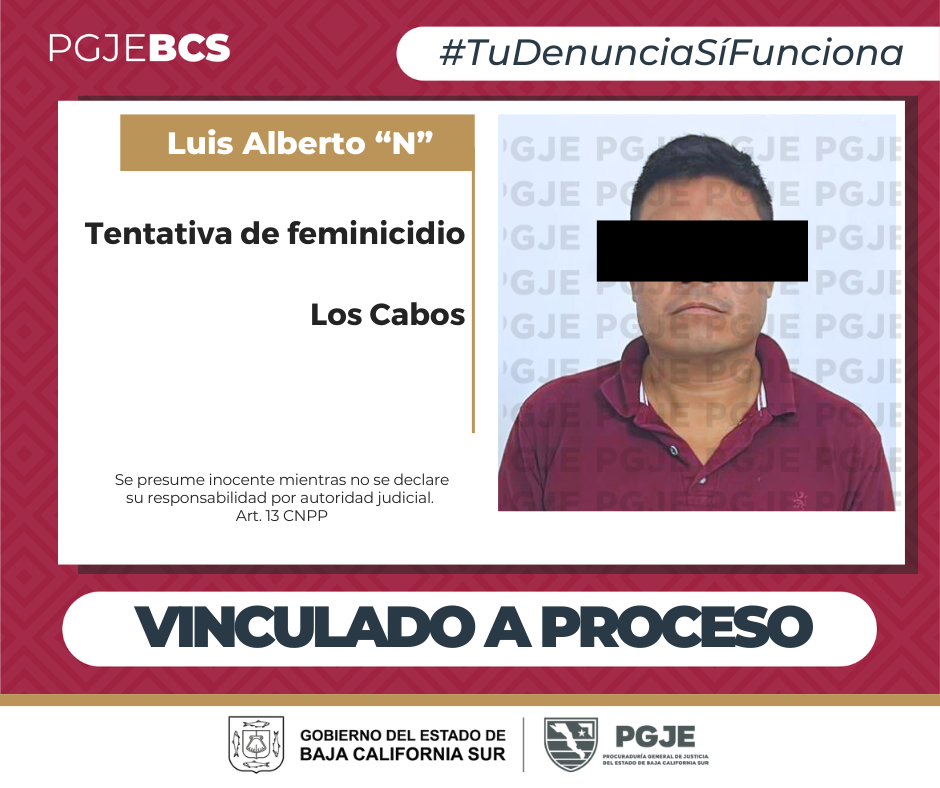 Los Cabos, BCS.- Gracias al trabajo de investigación, la recolección de indicios y las pruebas periciales presentadas por el agente del Ministerio Público de la Unidad Especializada para la Investigación y Persecución de los Delitos de Homicidios Dolosos, la Procuraduría General de Justicia del Estado (PGJE) de Baja California Sur obtuvo la vinculación a proceso de Luis Alberto “N” por su probable responsabilidad en el delito de feminicidio en grado de tentativa inacabada, en agravio de su pareja.