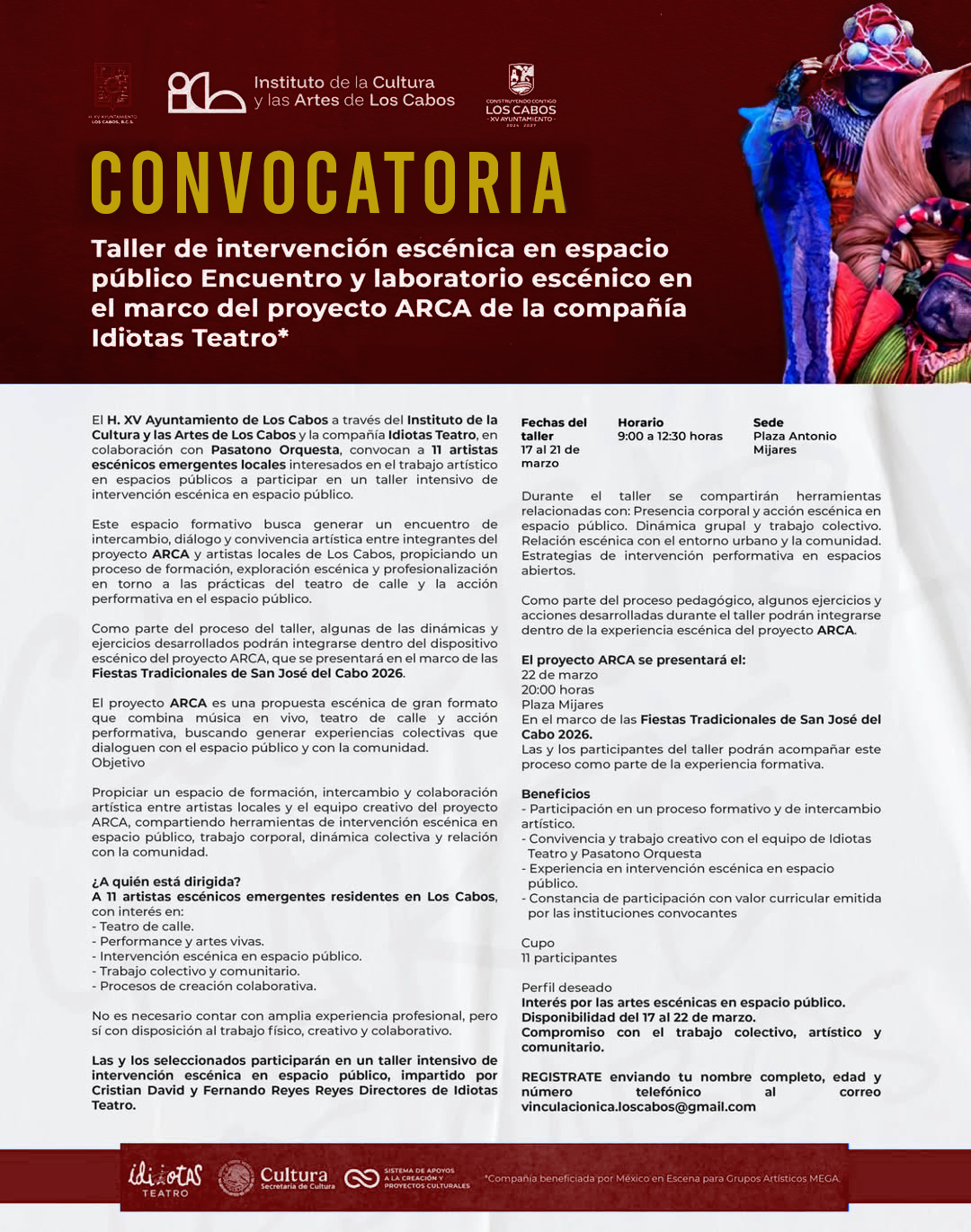 Los Cabos, Baja California Sur.– El XV Ayuntamiento de Los Cabos, a través del Instituto de la Cultura y las Artes (ICA), en colaboración con la compañía Idiotas Teatro y Pasatono Orquesta, convoca a artistas escénicos emergentes del municipio a formar parte del taller de intervención escénica en espacio público “Encuentro y laboratorio escénico”, en el marco del proyecto ARCA y de las Fiestas Tradicionales de San José del Cabo 2026.