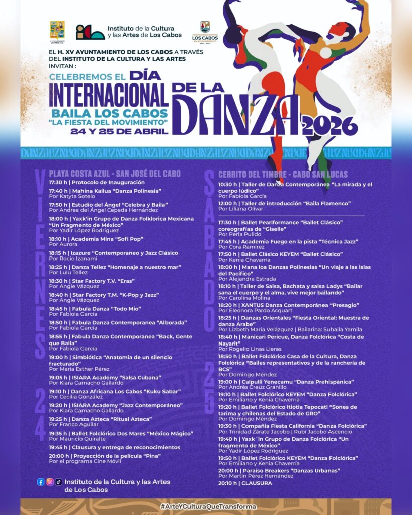 Los Cabos, Baja California Sur.– En el marco del Día Internacional de la Danza, el XV Ayuntamiento de Los Cabos, a través del Instituto de la Cultura y las Artes (ICA), invita a la ciudadanía a participar en “Baila Los Cabos: La Fiesta en Movimiento”, evento gratuito que se desarrollará los días 24 y 25 de abril con actividades artísticas y recreativas para toda la familia.