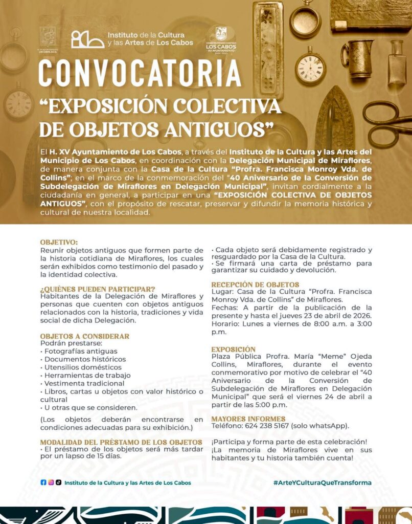 Asimismo, el viernes 24 de abril se llevará a cabo la Exposición Colectiva de Objetos Antiguos, en la plaza pública María “Meme” Ojeda Collins, a partir de las 17:00 horas, donde se exhibirán piezas históricas como testimonio del pasado y patrimonio colectivo de Miraflores.