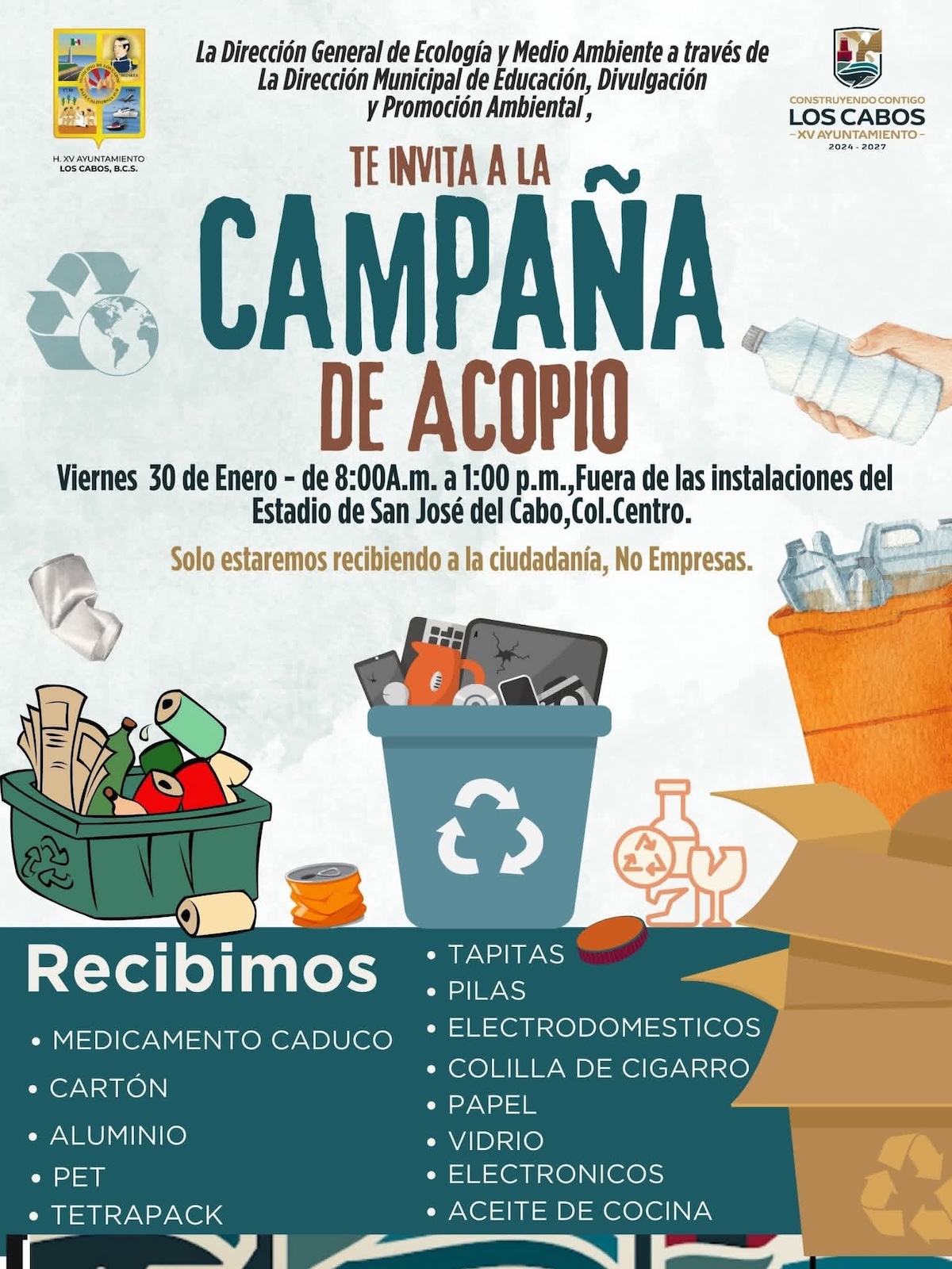 El XV Ayuntamiento de Los Cabos, a través de la Dirección General de Ecología y Medio Ambiente, invita a la ciudadanía a sumarse a la primera campaña de acopio de materiales reciclables que se realizará en este 2026.