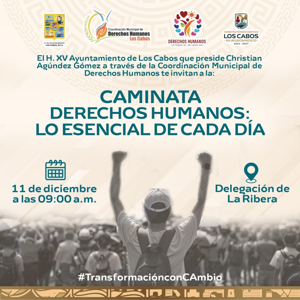 Los Cabos, Baja California Sur.- El XV Ayuntamiento de Los Cabos, a través de la Coordinación Municipal de Derechos Humanos invitó a la población a sumarse a las caminatas realizadas en el marco del Día Internacional de los Derechos Humanos, como parte del compromiso de la administración encabezada por el presidente municipal Christian Agúndez Gómez, de acercar espacios de participación y reflexión a la comunidad.