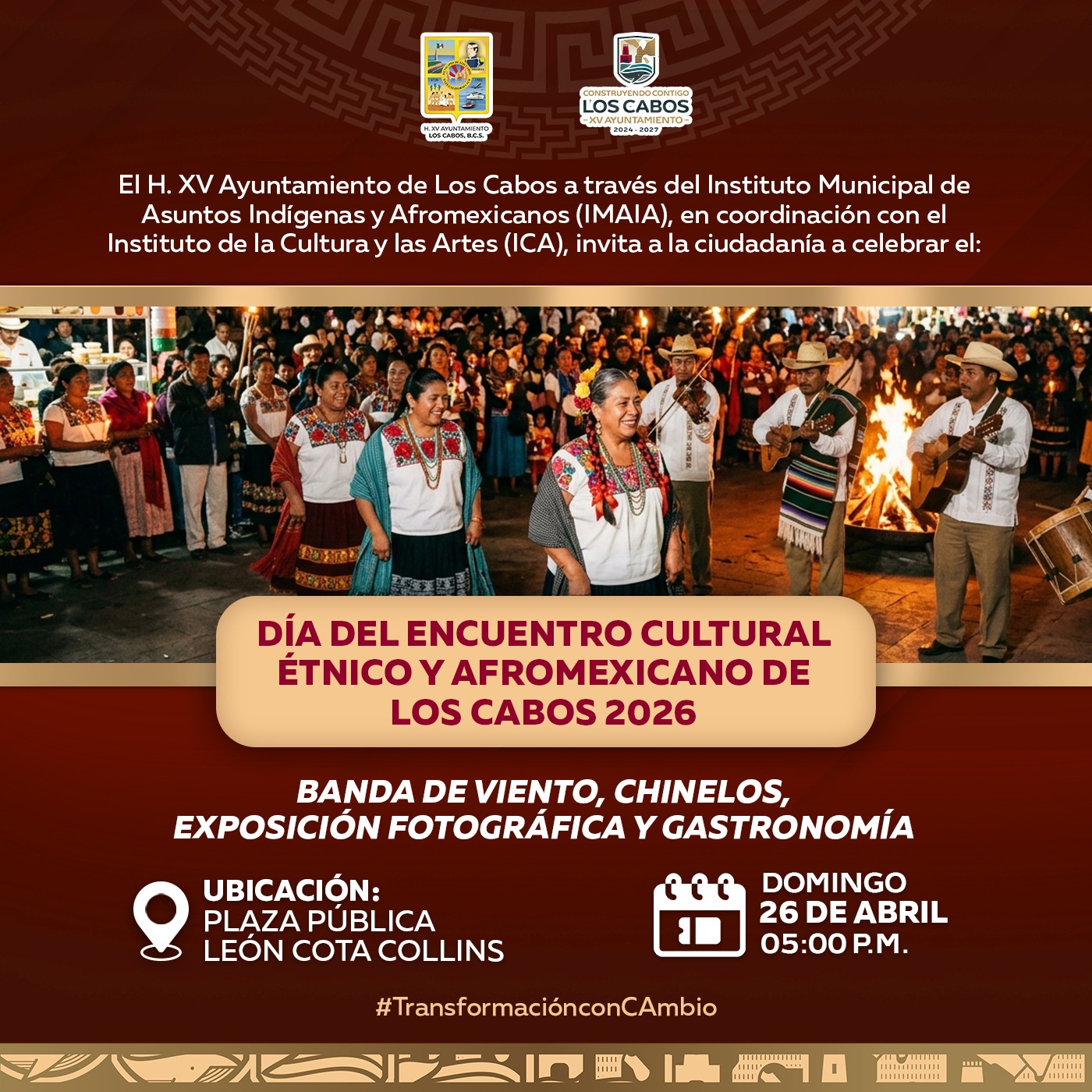 Los Cabos, Baja California Sur.– El XV Ayuntamiento de Los Cabos, a través del Instituto Municipal de Asuntos Indígenas y Afromexicanos, en coordinación con el Instituto de la Cultura y las Artes (ICA), invita a la ciudadanía a participar en el “Día del Encuentro Cultural Étnico y Afromexicano de Los Cabos 2026”.