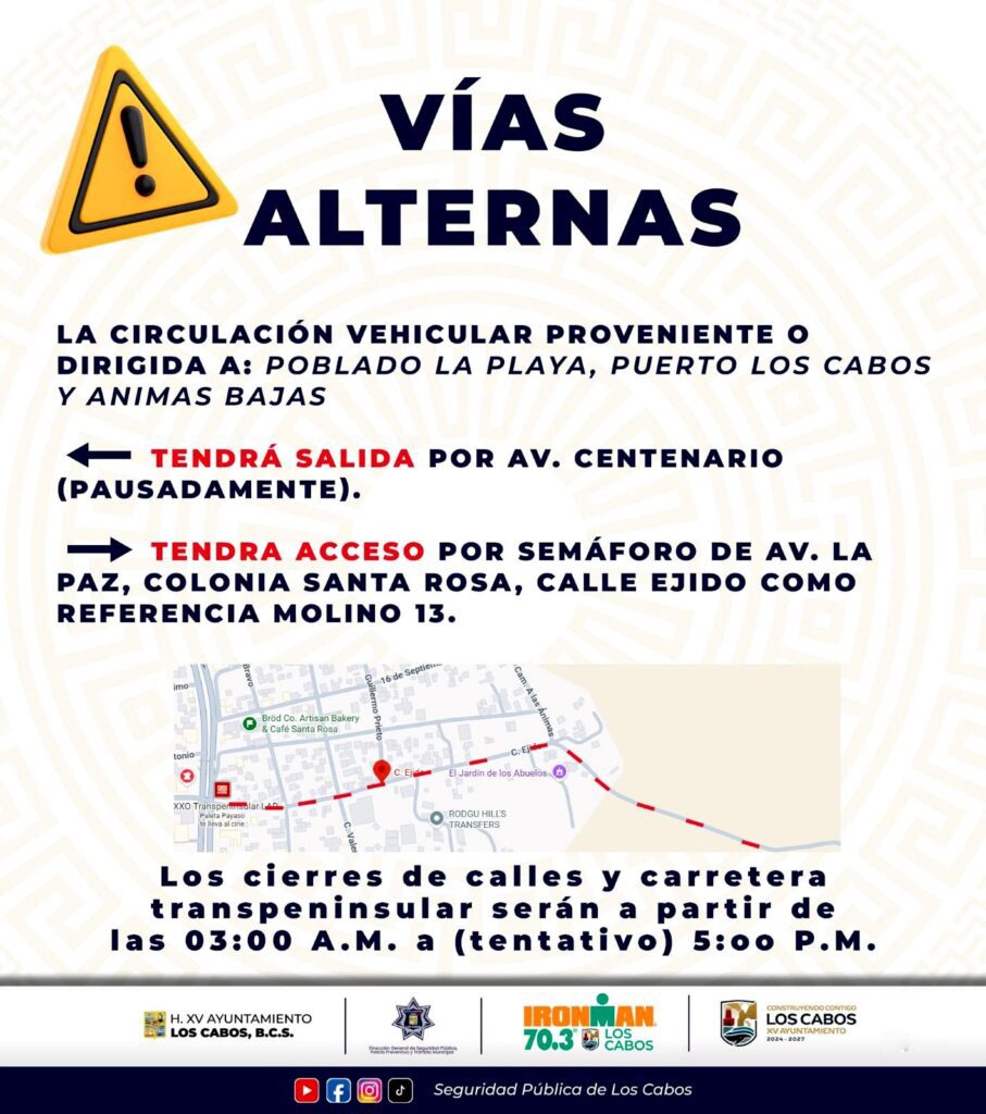 Los Cabos, Baja California Sur.– El XV Ayuntamiento de Los Cabos, a través de la Dirección General de Seguridad Pública, Policía Preventiva y Tránsito Municipal, informó sobre cierres temporales de vialidades con motivo del evento internacional Ironman 70.3 Los Cabos, programado para este domingo 26 de abril.