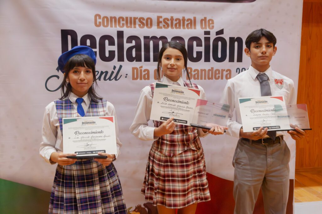 Elsa Darina Murillo Reyes, de la secundaria Benito Juárez en Loreto, obtuvo el primer lugar con la poesía “Patria, Guerra y Gloria” y recibió un premio de 4 mil pesos. La estudiante presentó su declamación durante la ceremonia cívica del Día de la Bandera, ante autoridades de los tres órdenes de gobierno encabezadas por el gobernador Víctor Manuel Castro Cosío.