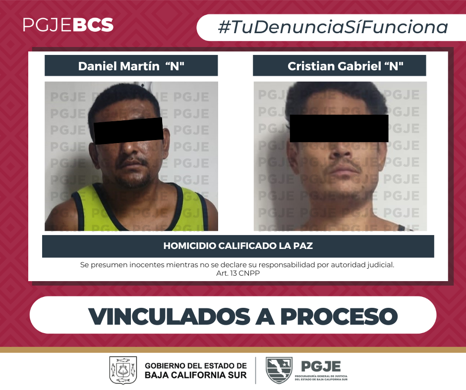 La Paz, BCS.- En la continuación de audiencia inicial por orden de aprehensión que se efectuó el lunes 29 de septiembre del año en curso en el Centro de Justicia Penal de La Paz, Cristian Gabriel “N” y Daniel Martín “N”, quedaron formalmente vinculados a proceso y permanecerán en prisión el tiempo que dure dicho proceso, imputados por el delito de homicidio calificado con ventaja en agravio de un hombre interno en el Cetro de Rehabilitación “Vida Solo Hay Una” en la ciudad de La Paz.