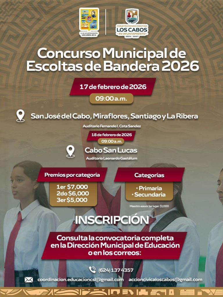 Los Cabos, Baja California Sur.– El XV Ayuntamiento de Los Cabos, a través de la Dirección General de Desarrollo Social y la Dirección Municipal de Educación, convoca a alumnas y alumnos de instituciones educativas públicas y privadas de nivel primaria y secundaria a participar en el Concurso Municipal de Escoltas 2026, con el objetivo de fortalecer los valores cívicos, el respeto a los símbolos patrios y la disciplina escolar.
