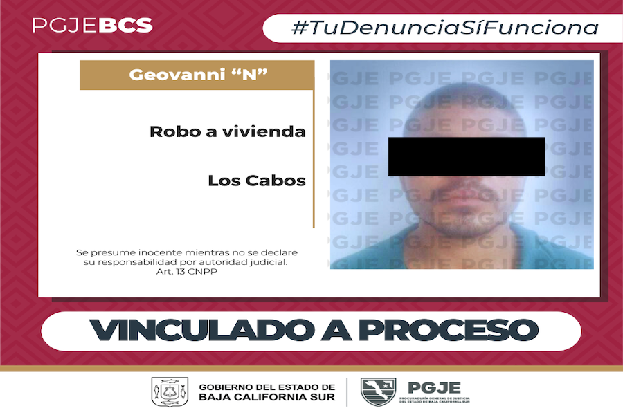 La Procuraduría General de Justicia del Estado (PGJE) de Baja California Sur, a través de la agente del Ministerio Público de la Unidad Especializada en Investigación del Delito de Robo, obtuvo vinculación a proceso de Geovanni Daniel “N”, por su probable responsabilidad en el delito de robo calificado a vivienda, durante la continuación de la audiencia inicial por ejecución de orden de aprehensión, realizada el 02 de diciembre de 2025.