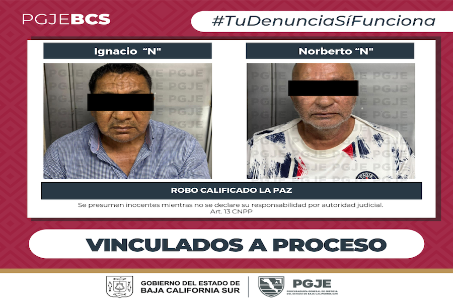La Procuraduría General de Justicia del Estado (PGJE) de Baja California Sur obtuvo vinculación a proceso de Ignacio “N” y Norberto “N”, imputados por el delito de robo calificado cometido por dos personas, ocurrido en la capital del estado el jueves 16 del mes en curso.