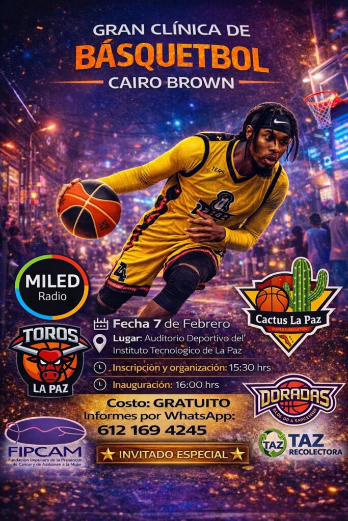 La clínica será impartida por el exjugador profesional Cairo Cules Brown, con la organización y respaldo de la Fundación Fipcam, Súper Stereo MILED La Paz, así como de las escuelas y clubes Toros La Paz, Doradas y Cáctus La Paz, quienes aportan experiencia, instructores y acompañamiento técnico.