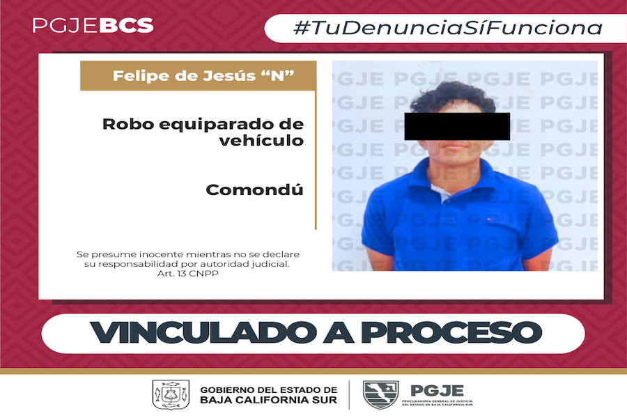 El 27 de diciembre del presente año se llevó a cabo la audiencia de control de detención en contra de Felipe de Jesús “N”, por su probable responsabilidad en el delito de robo equiparado de vehículo de motor, donde la Procuraduría General de Justicia del Estado (PGJE) de Baja California Sur obtuvo vinculación a proceso en su contra.