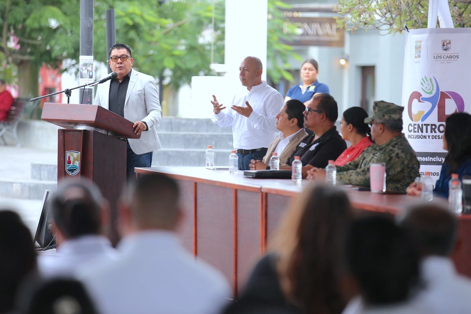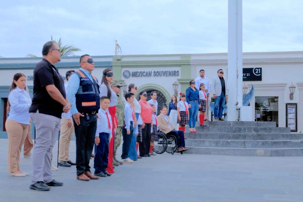 Los Cabos, Baja California Sur.- Durante la ceremonia de honores a la bandera, organizada por el Instituto Municipal para el Desarrollo e Inclusión de Personas con Discapacidad (IMDIS), el secretario general Alberto Rentería Santana encabezó el acto cívico en representación del presidente municipal, Christian Agúndez Gómez. En el evento participaron autoridades del XV Ayuntamiento de Los Cabos, integrantes del Cabildo, así como estudiantes, docentes y personal del servicio público.