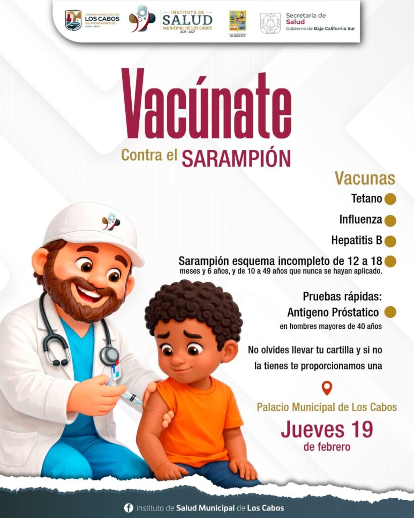 El jueves 19 de febrero de 09:00 a 13:00 horas, se instalará un puesto de vacunación al interior del Palacio Municipal en San José del Cabo, donde se aplicarán dosis contra sarampión, tétano, influenza y hepatitis B, como parte de esta estrategia interinstitucional entre los tres órdenes de gobierno.