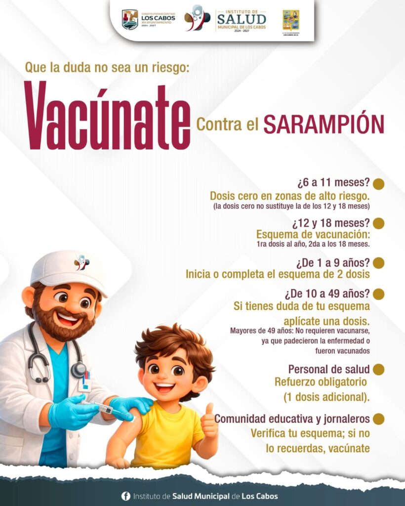 Los Cabos, Baja California Sur.– Ante la confirmación del primer caso de sarampión en la entidad por parte de la Secretaría de Salud de Baja California Sur, el XV Ayuntamiento de Los Cabos informa que las acciones preventivas que se desarrollan en el municipio forman parte de una estrategia coordinada con las instancias estatales y federales, con el objetivo de proteger a la población y contener la propagación del virus.