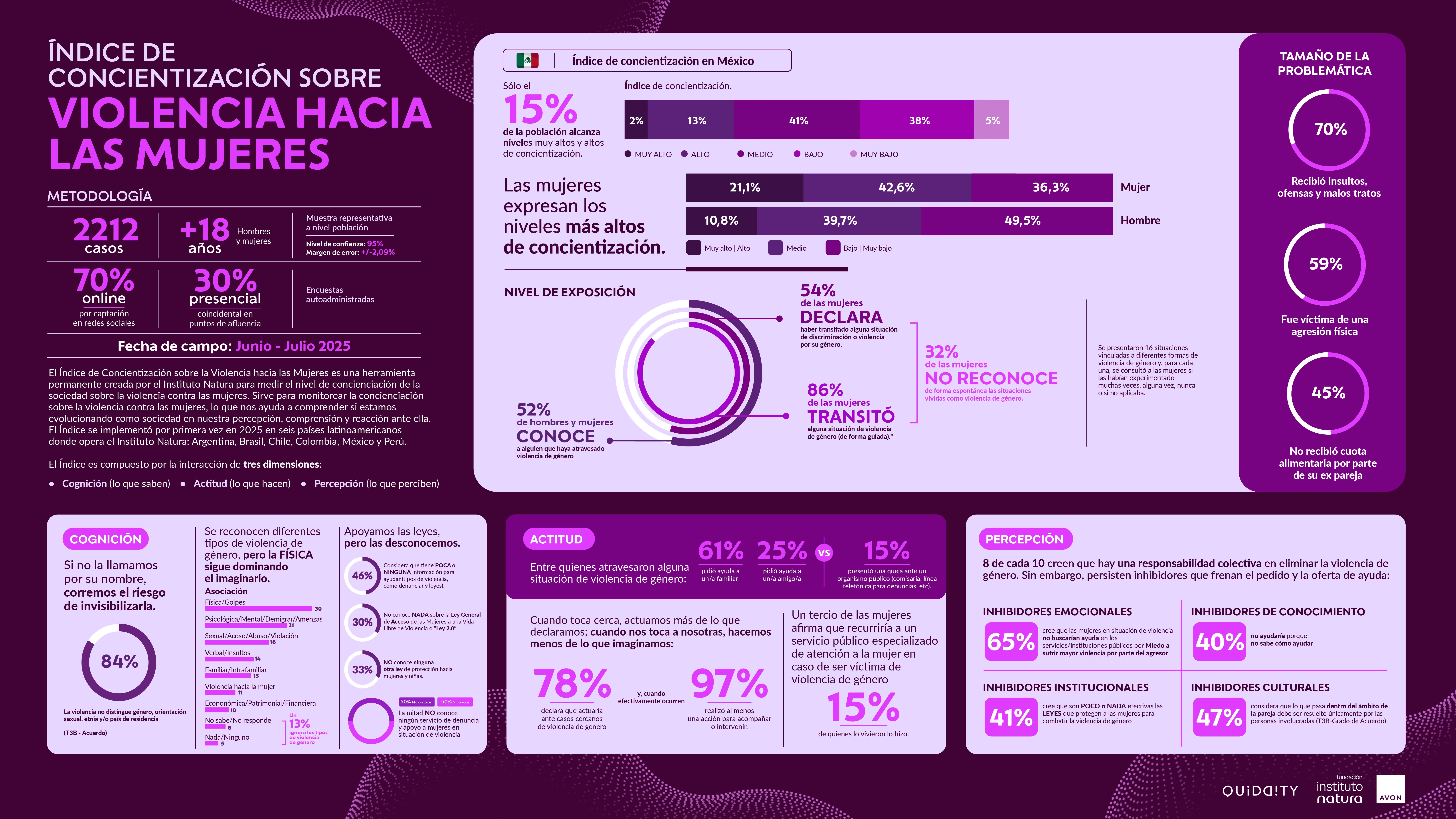 De acuerdo con el Índice de Concientización sobre Violencia de Género 2025, elaborado por Fundación Instituto Natura y Avon, en México persiste una percepción limitada de lo que realmente es la violencia, ya que se suele reconocer solo la física y la sexual, pero se ven —o no se nombran— otras formas que afectan la vida de las mujeres todos los días.