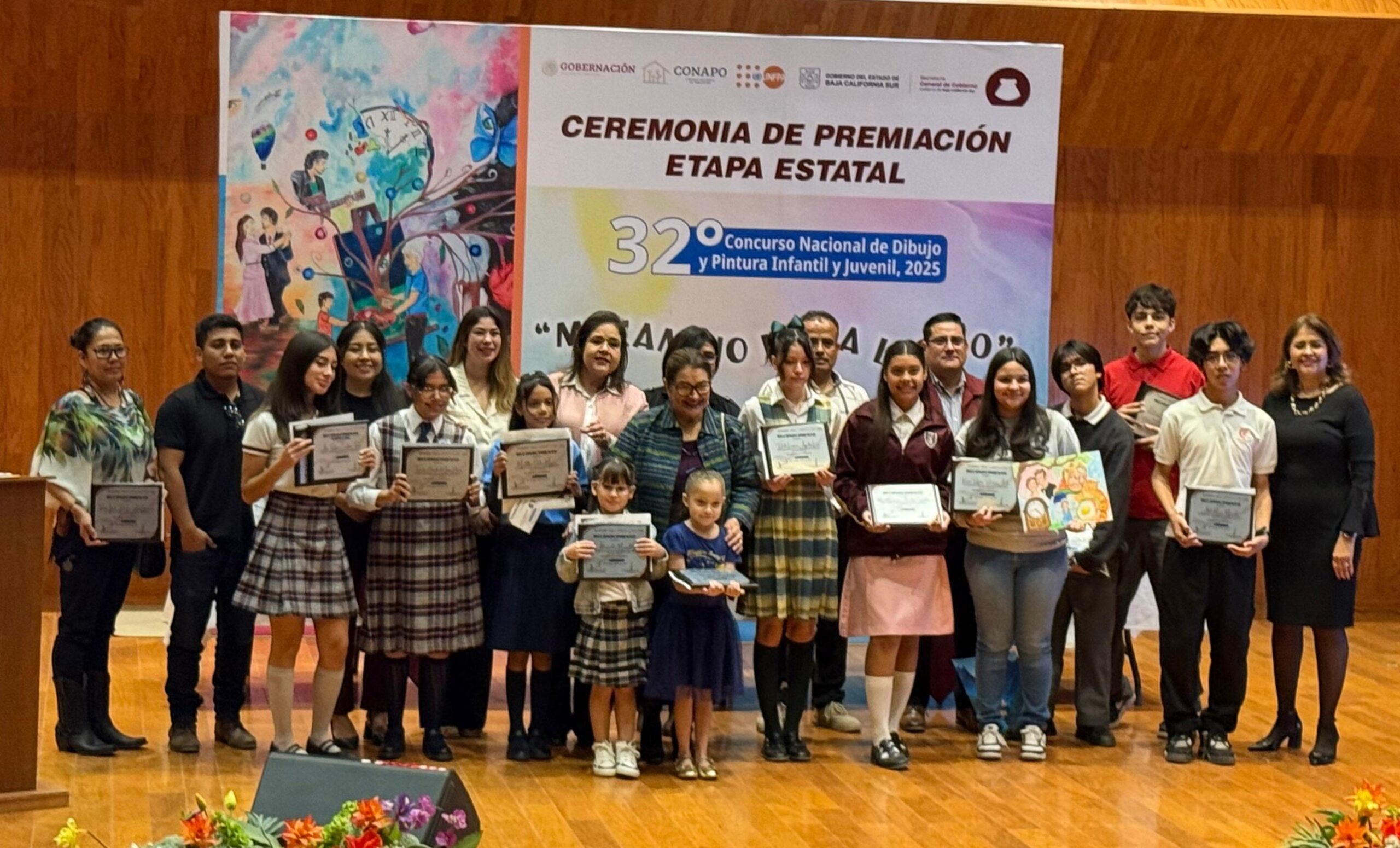 Con la entrega de estímulos económicos y reconocimientos a niñas, niños, adolescentes y jóvenes ganadores del Concurso Nacional de Dibujo y Pintura Infantil y Juvenil 2025, concluye la etapa estatal en Baja California Sur, coordinado por la Secretaría General de Gobierno con el apoyo de instituciones estatales, federales y municipales, principalmente del sector educativo y promovido por el Consejo Nacional de Población (CONAPO) y del Fondo de Población de las Naciones Unidas en México.