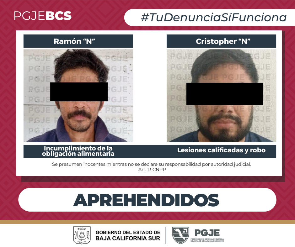Agentes de Investigación realizaron diversos operativos, mediante los cuales aprehendieron a 2 personas del sexo masculino en los municipios de Mulegé y La Paz, en seguimiento a investigaciones por denuncias de hechos ilícitos ante la Procuraduría General de Justicia del Estado (PGJE).