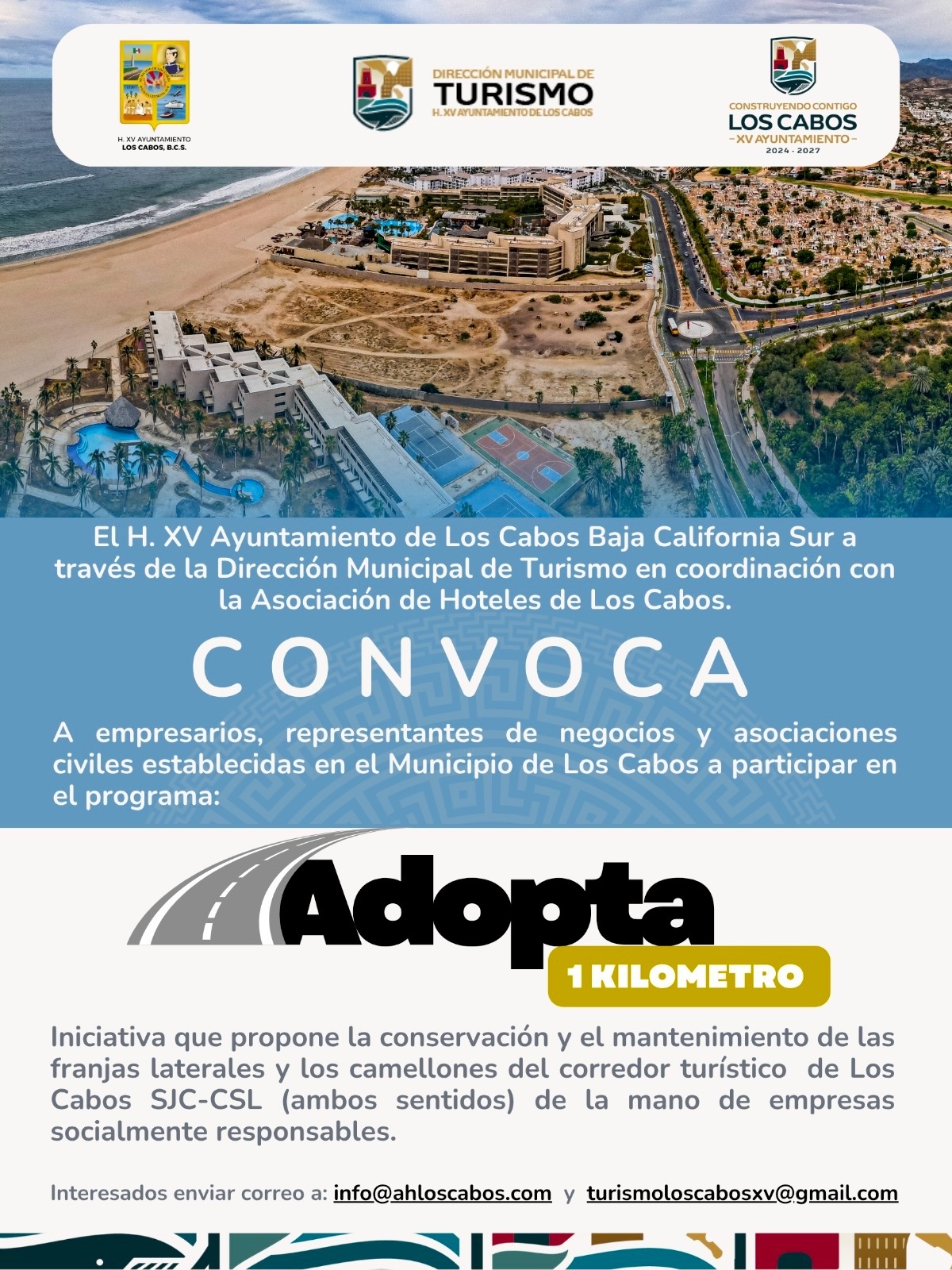 Con el propósito de fortalecer la imagen urbana y fomentar la participación social en el cuidado del entorno, el XV Ayuntamiento de Los Cabos, a través de la Dirección Municipal de Turismo y en coordinación con la Asociación de Hoteles de Los Cabos (AHLC), invita a empresas, restaurantes, comercios y asociaciones civiles a sumarse al programa “Adopta 1 Kilómetro”.