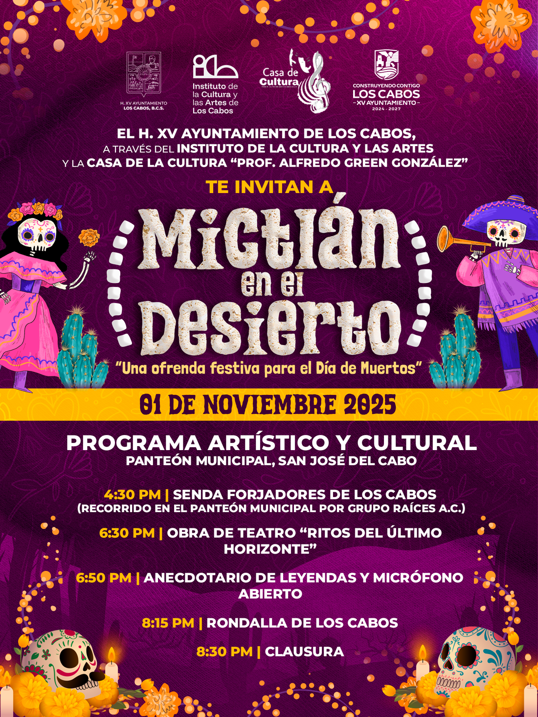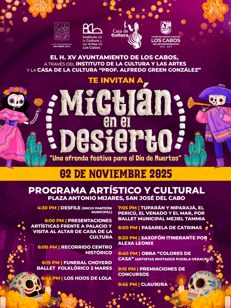 Los Cabos, Baja California Sur.– El XV Ayuntamiento de Los Cabos, a través del Instituto de la Cultura y las Artes (ICA), invita a la ciudadanía a participar en la celebración del Día de Muertos 2025 “Mictlán en el Desierto”, una jornada dedicada a la tradición, el arte y la memoria colectiva.