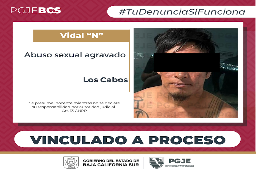 Como resultado de la labor realizada por la Unidad de Investigación y Judicialización de Delitos Contra la Libertad Sexual y la Familia, la Procuraduría General de Justicia del Estado (PGJE) de Baja California Sur logró el auto de vinculación a proceso y la medida cautelar de prisión preventiva contra Vidal “N”, por su probable responsabilidad en el delito de abuso sexual en agravio de una persona menor de edad.