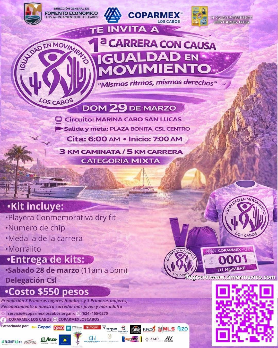 Los Cabos, Baja California Sur.– El XV Ayuntamiento de Los Cabos, a través de la Dirección General de Fomento Económico, en colaboración con Coparmex Los Cabos, invita a la ciudadanía a participar en la 1ª Carrera con Causa “Igualdad en Movimiento”, evento deportivo y social que se realizará el próximo domingo 29 de marzo en Cabo San Lucas.