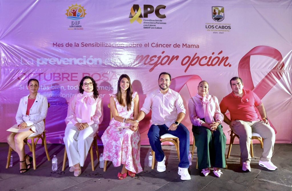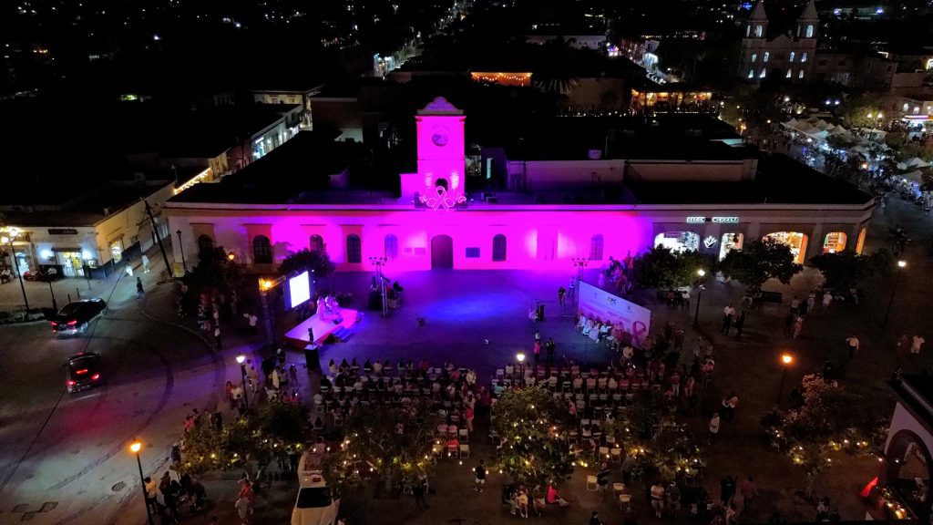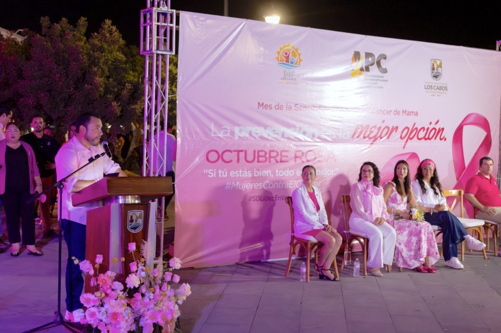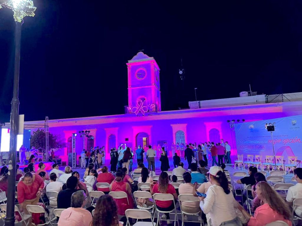 Los Cabos, Baja California Sur.– El XV Ayuntamiento de Los Cabos, a través del Sistema Municipal para el Desarrollo Integral de la Familia (DIF), llevó a cabo el encendido rosa del palacio municipal, un acto simbólico que marcó el inicio oficial del Mes Rosa, dedicado a la prevención y detección temprana del cáncer de mama.