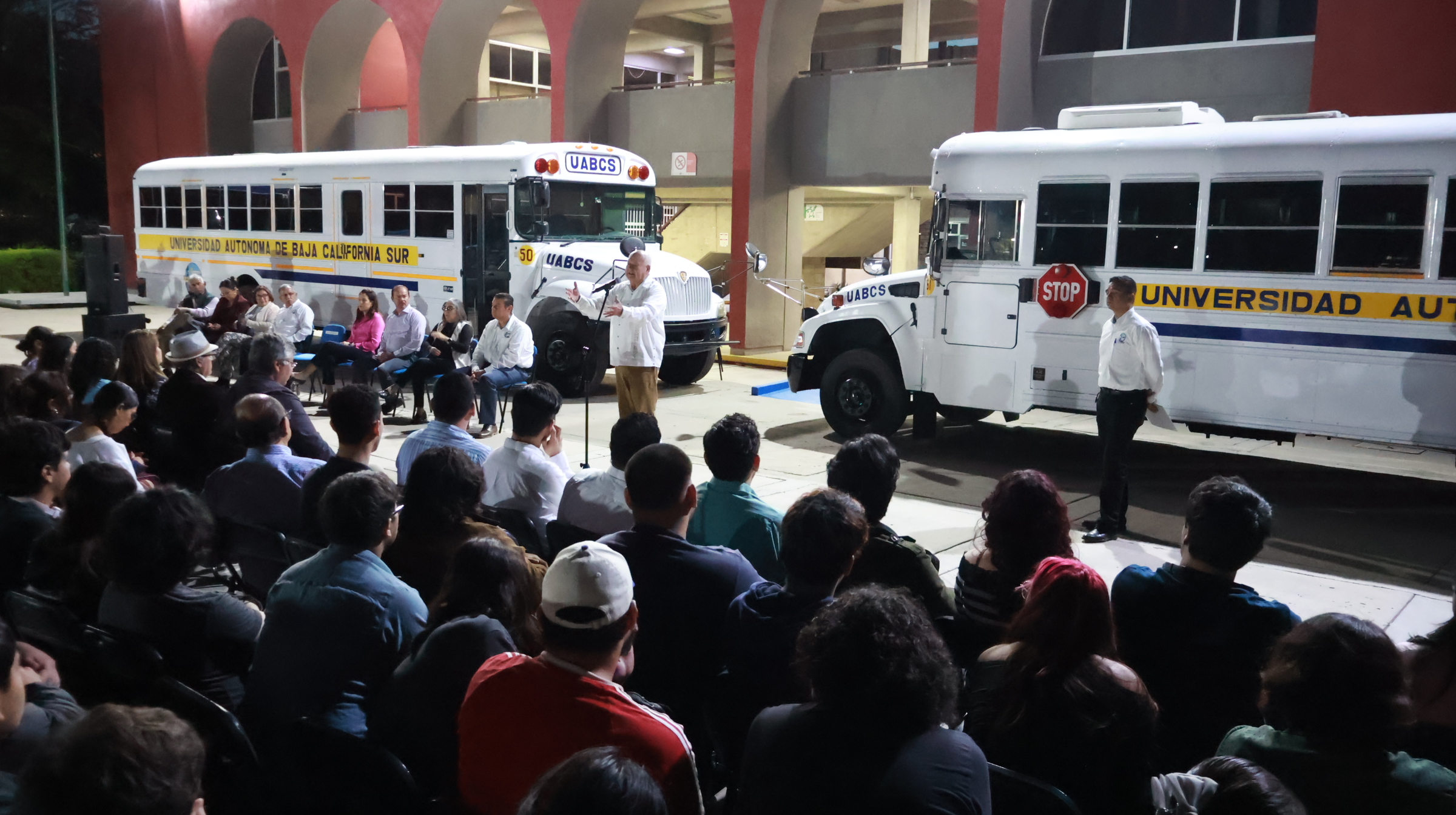 En la reunión con la comunidad universitaria, Castro Cosío entregó 2 autobuses para prácticas de campo, 1 tractor, 1 pipa para transporte de agua y 1 embarcación equipada, recursos que fortalecerán la formación práctica de los estudiantes.