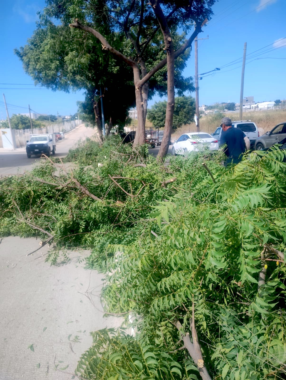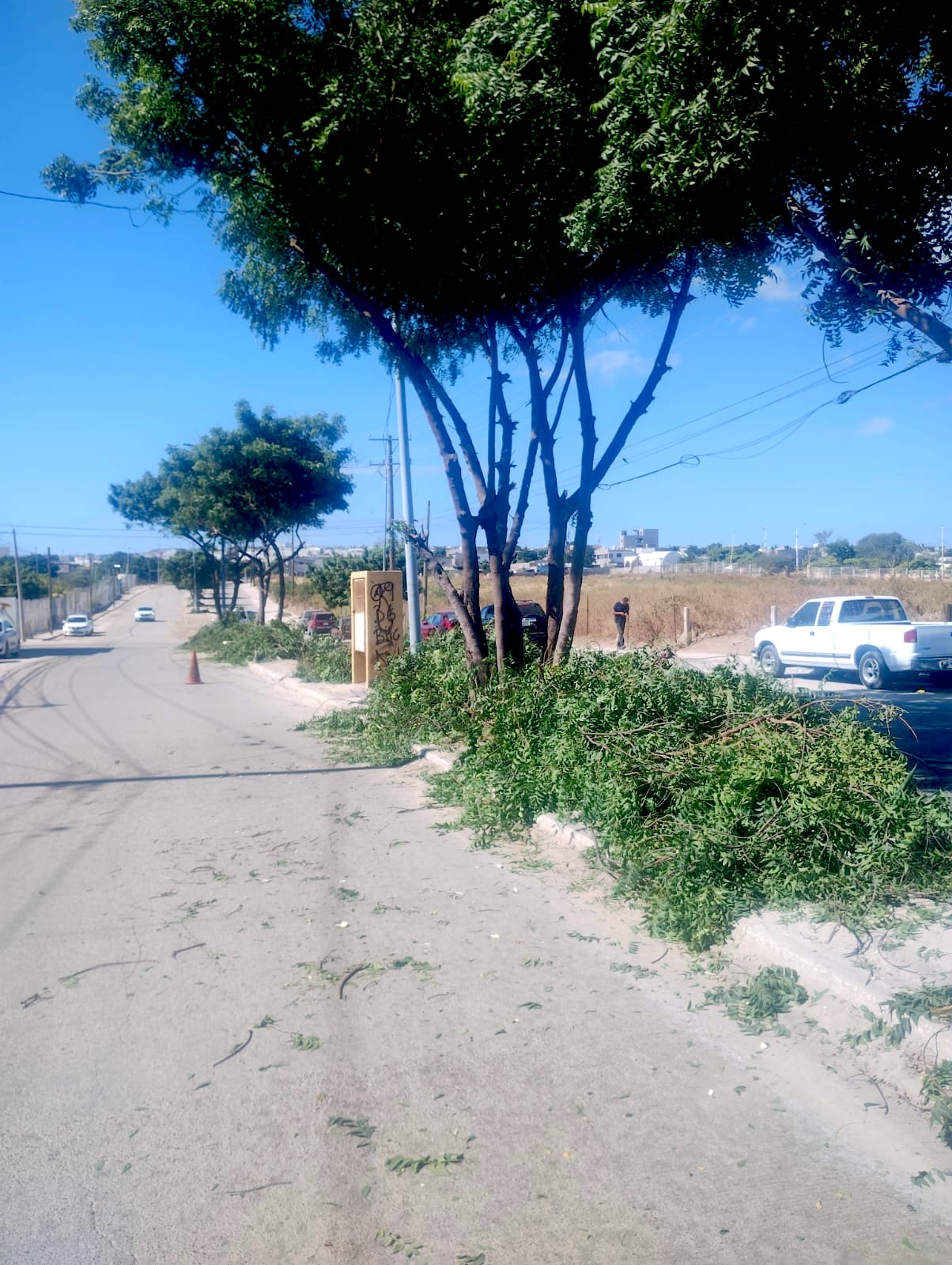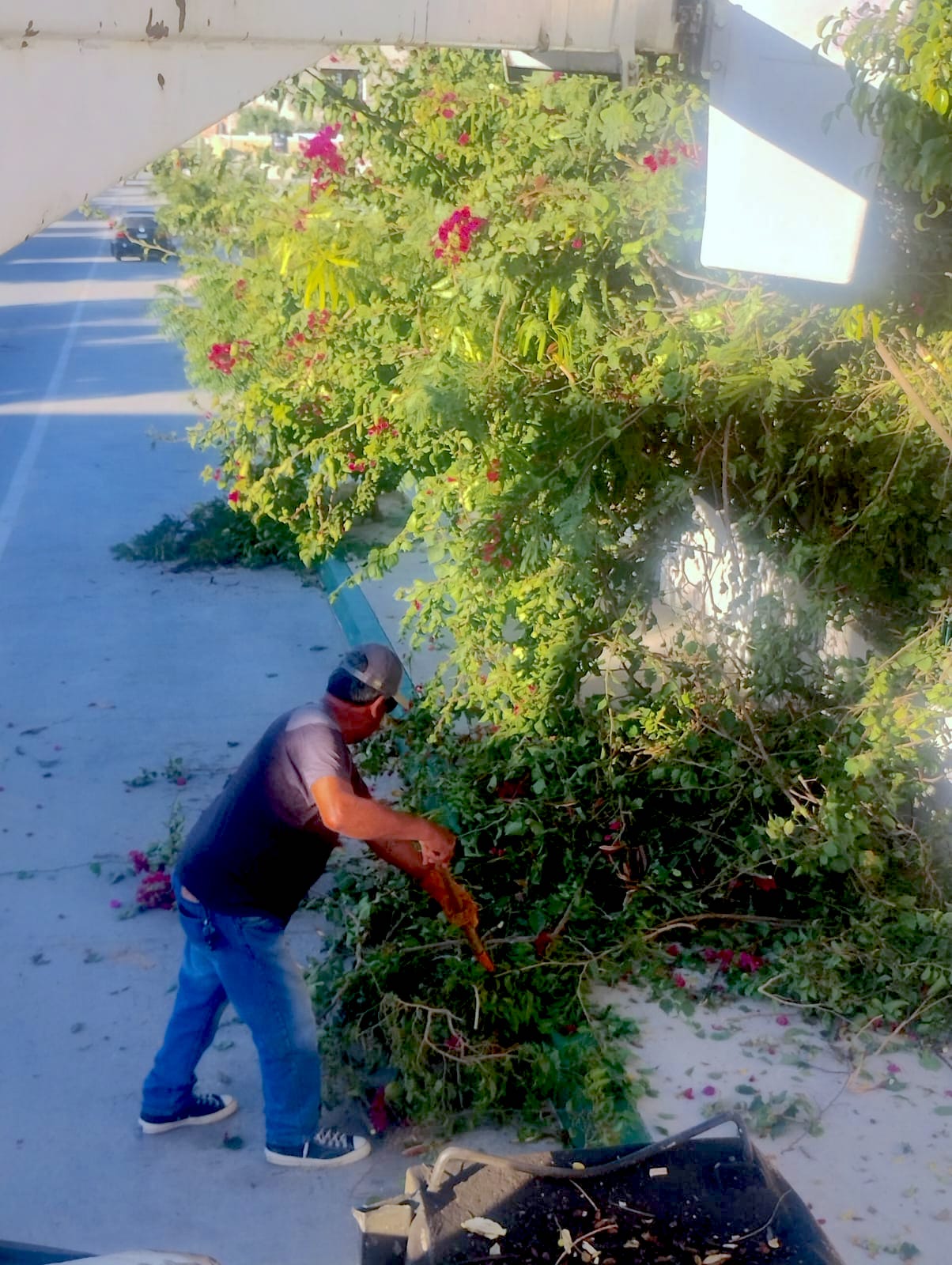 De igual manera, atendiendo solicitudes ciudadanas, el equipo de Áreas Verdes realizó la poda de una bugambilia frondosa y un árbol en la Casa de Día de la colonia Los Cangrejos, asegurando el adecuado mantenimiento de este espacio destinado a la atención de personas adultas mayores. También se llevó a cabo la poda de 22 árboles en el plantel Cobach #04, acciones que igualmente requirieron el uso de grúa.