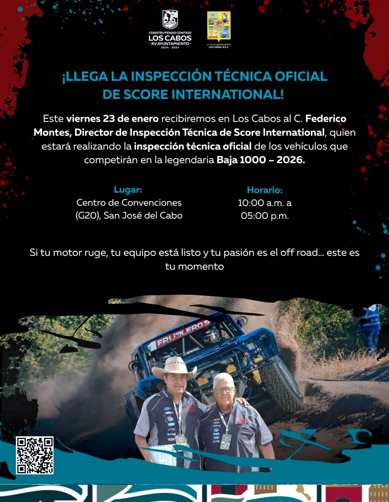 Los Cabos, Baja California Sur.– El XV Ayuntamiento de Los Cabos, a través de la Dirección Municipal de Relaciones Públicas, informa que este viernes 23 de enero se llevará a cabo en el municipio la inspección técnica oficial de los vehículos que competirán en la Baja 1000 2026, como parte de las actividades previas a esta emblemática competencia del off road internacional.