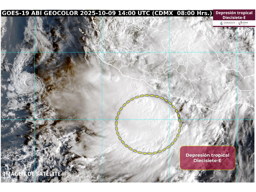 Los Cabos, BCS (9 de octubre de 2025).– El Servicio Meteorológico Nacional (SMN) confirmó esta mañana la formación de la depresión tropical Diecisiete-E frente a las costas de Guerrero, sistema que mantiene amplia nubosidad y potencial de lluvias fuertes hacia el occidente del país, incluyendo Baja California Sur durante el fin de semana.