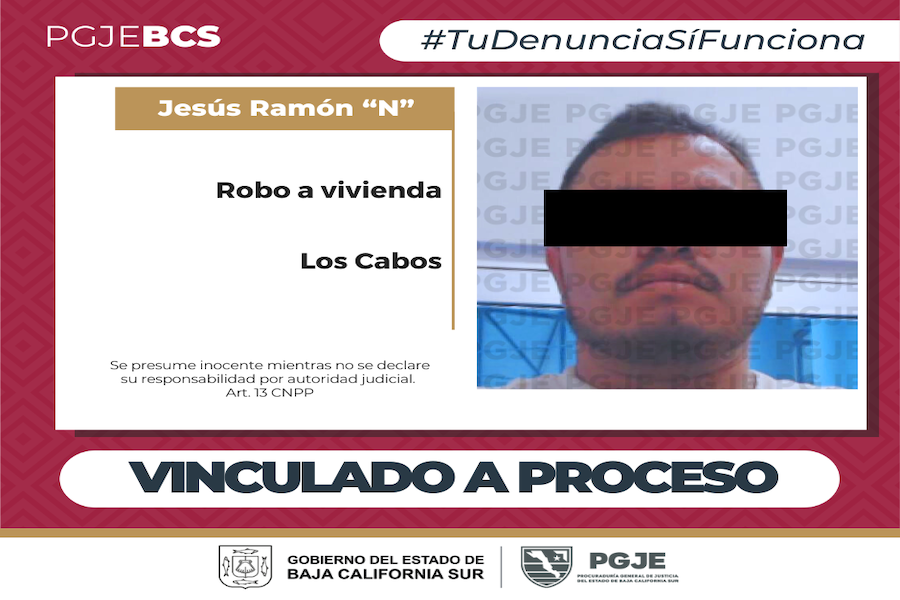 La Procuraduría General de Justicia del Estado (PGJE) de Baja California Sur, a través de la Unidad Especializada en Investigación del Delito de Robo, obtuvo la vinculación a proceso en contra de Jesús Ramón “N”, por su probable responsabilidad en el delito de robo calificado cometido en vivienda con violencia moral en las personas.